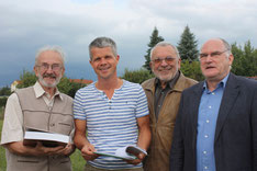 Bevor der Altmeister der Brandenburgischen Mittelalternumismatik, Dr. Hans-Dieter Dannenberg (2.v.r.) mit dem Vorsitzenden der Potsdamer Münzfreunde Wilko Krone (r.) den spektakulären Münzfund von Götz bei Brandenburg/Havel vorstellte, gab es etliche nützliche Fachgespräche am Rande. Horst Gutsche (l.), Chef der Herzberger Münzfreunde, tauschte sich mit Wilko Krone vor allem über Vereinsangelegenheiten und über Organisatorisches aus. Ulf Lehmann (2.v.l.) fand als begeisterter Sammler mittelalterlicher Zahlungsmittel in Dr. Hans-Dieter Dannenberg einen versierten Gesprächspartner. Der Herzberger ist während seiner regionalgeschichtlichen Forschungen vor wenigen Monaten auf den tatsächlichen urkundlichen Nachweis einer mittelalterlichen Münzprägung in Herzberg gestoßen. Für Hans-Dieter Dannenberg war das eine Neuigkeit, denn bisher fehlte der Quellennachweis dafür, dass Herzberg eine eigene Münzprägestätte besaß. Er versicherte, seine bisherigen Forschungen zur mittelalterlichen Münzkunde um diesen neuen Beleg zu ergänzen.